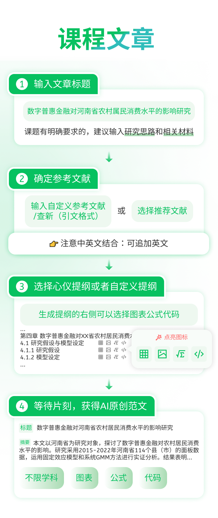 网络数据、图、表、公式、代码(仅供参考,小节右侧勾选)提纲处自定义插入,数据、图表、公式、代码结合上下文生成,内容不空洞